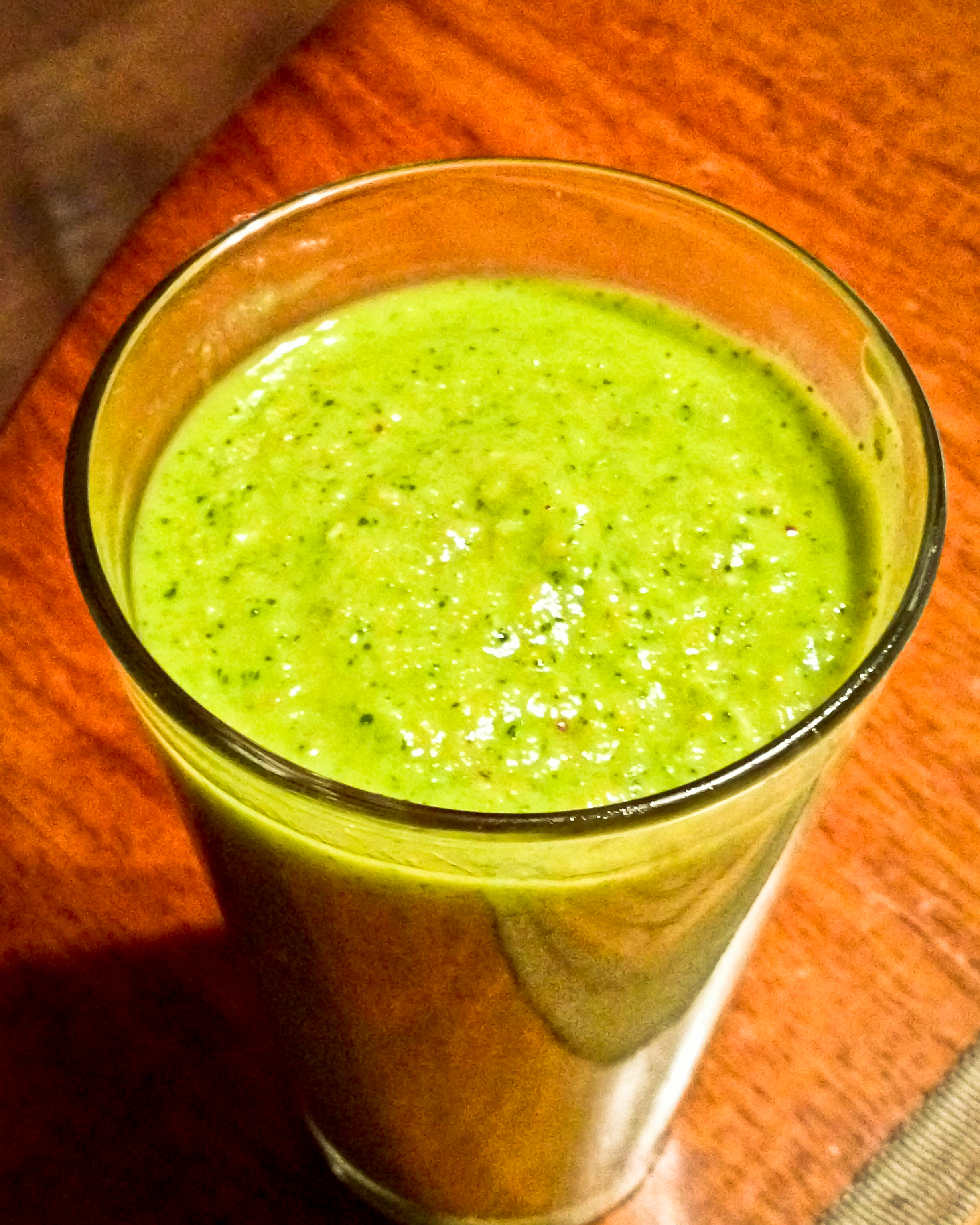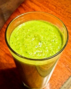 I recommend blending the kale, spinach, ginger and carrots a little on their own first, then adding the fruit and tea after. Make sure the Green Tea has cooled to room temperature. Give it a little longer to blend than you normally would. Of course, if you are using a real blender instead of my basic food processor it might not be as much of an issue. The whole thing tastes pretty good. The tea goes well with the greens and ginger, and the stevia and apple really are great for sweetening it up. The avocado is a perfect substitute for yogurt to make it creamy. I will definitely make this again.