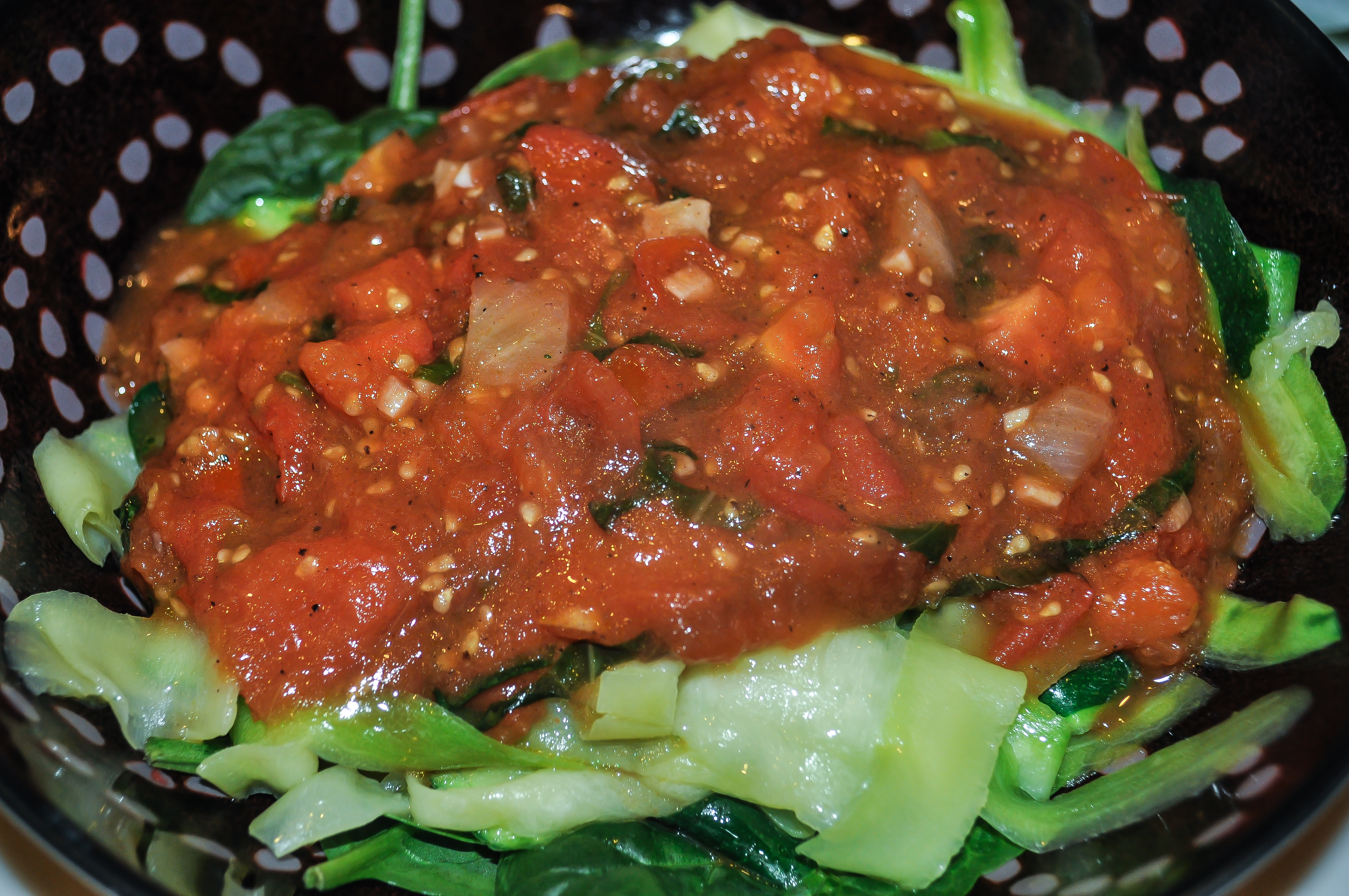 - I served the zucchini and sauce over some fresh spinach to add extra nutrients and calories. You could also add parmesan cheese or even something like grilled chicken.