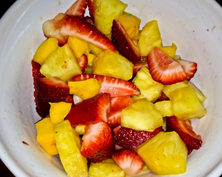 The instructions are easy. Chop all the fruit. Add to a bowl. Pour dressing over the fruit. Mix until dressing is spread over everything and the fruit is mixed well. Obviously variations abound. You could do more or less of any of the three fruits or add in other elements. Kiwi might be good, or papaya if you’re fancy.