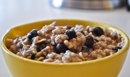 I really enjoyed this porridge. Hot cereal with fruit has become one of my favorite brunch-hour items. I’ve read reviews where people don’t like steel cut oats because they are too hard or chewy. I think for a lot of people it’s one of those things where they eat them because they are trendy amongst the healthy-eating crowd. But I liked them a lot. I think this slow boil-to-simmer technique (and using milk instead of just water) really helped soften them up. I like that they are a more substantive food than regular oatmeal. A little tiny bit of chewing never hurt anyone. Unless you’re being eaten by a predator, I guess. Back to the recipe, adding the vanilla really brought out both the almond and the blueberry flavor.