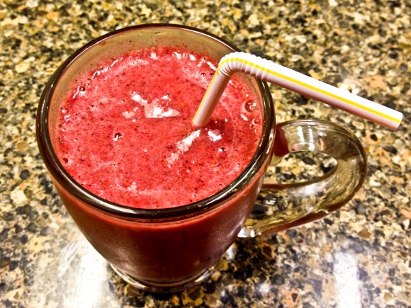 The only problem with not eating anything else for the rest of the day was that I didn’t want my only nutrients coming from cooked canned tomatoes and the banana I ate for breakfast. Thus, I decided to turn to my old stand-by, the smoothie. I knew that it would give me more vitamins and nutrients, and might serve to counteract the bad things I put into my system with that Achilles’ heel, the pizza. Plus, I thought I could probably use several cleansing ingredients that might make me feel less greasy. And, even though I really wasn’t hungry, I knew my body (or my brain at least) would expect to have some dinner. Therefore, the smoothie was just the trick. I wanted to make it as packed as possible with macro and micro nutrients, so I tried to find ingredients that would compliment each other for tastiness and also would go well with the several “add-ons” I planned to use. The result was not necessarily an attractive mixture, but it did taste pretty dang delicious.
